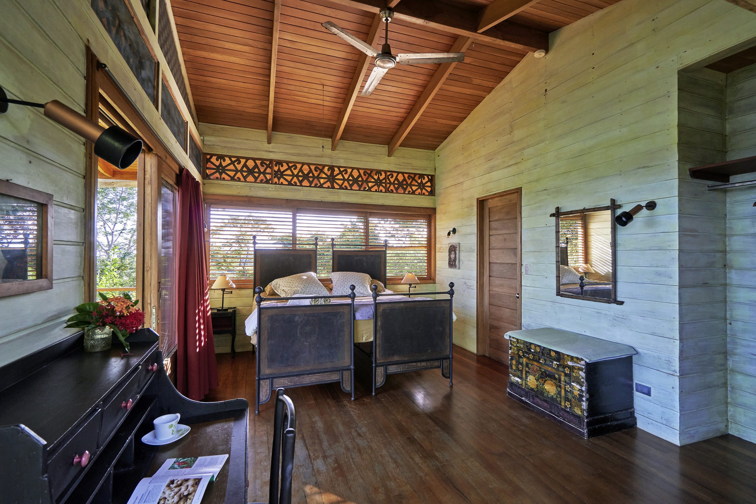 Named after our first intention to hang dozens of mirrors on the walls, the Vanity is now filled with exotic birds paintings. The room opens onto the garden and the shimmering pool on one side and the mystery of the jungle on the other; it’s simply furnished with two single beds.
